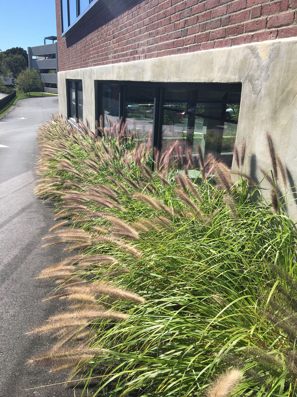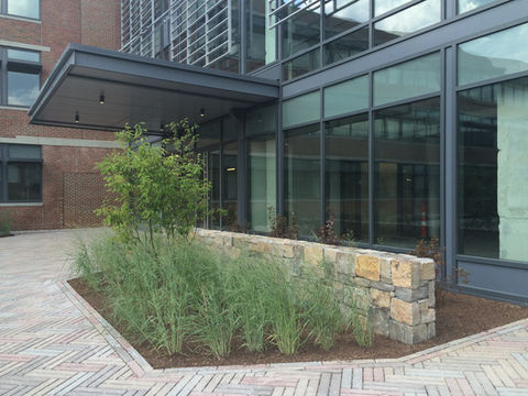 The landscape was designed to reflect some of the industrial heritage of the building with rustic detailing. Green infrastructure measures were incorporated with porous pavements; a native-dominant plant palette; and, bio-swales to capture, treat, and infiltrate rainwater. The driveway is shared with the adjacent elementary school to make the most or the dense development. Pedestrian walkways, a terraced outdoor dining area, and picnic tables within the greenspace were placed for a diversity of spaces for the workers.