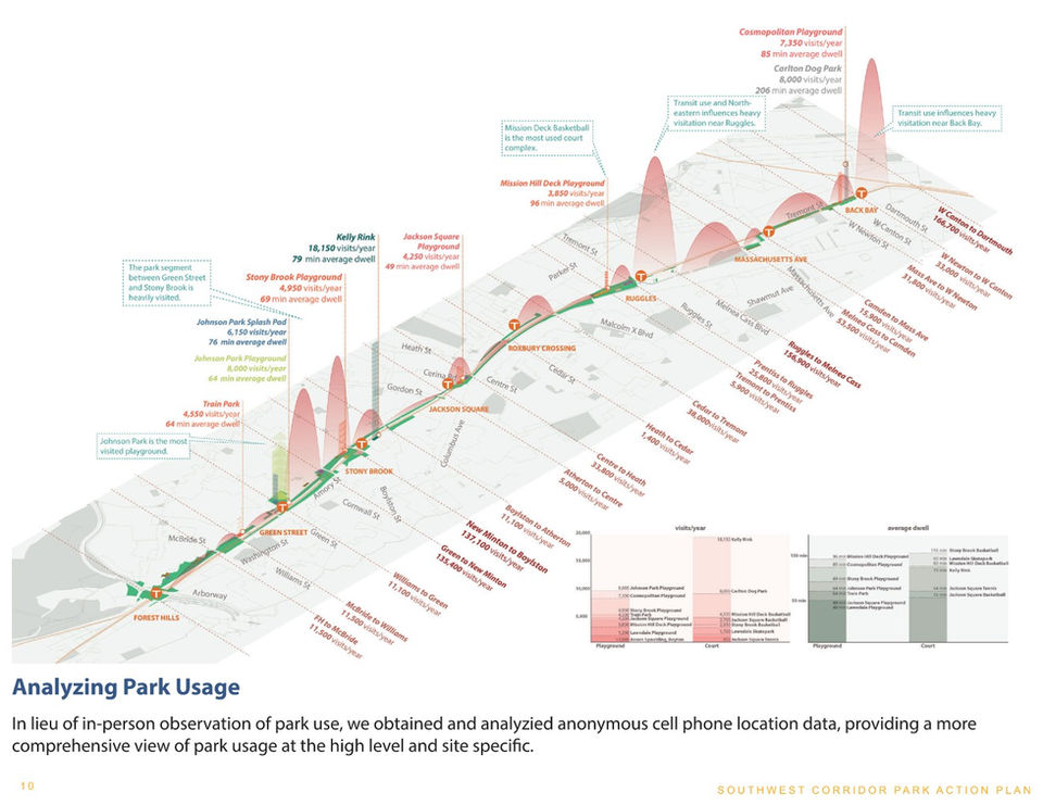 The Southwest Corridor Park (SWCP) is a four-mile greenway stretching from Back Bay Station to Forest Hills Station, running alongside and over the MBTA Orange Line through several Boston neighborhoods, including Back Bay, South End, Roxbury, Fenway, Mission Hill, and Jamaica Plain. The 52-acre park connects eight transit stations and offers a wide range of amenities, from community gardens and playgrounds to athletic courts, a skate park, and open space.