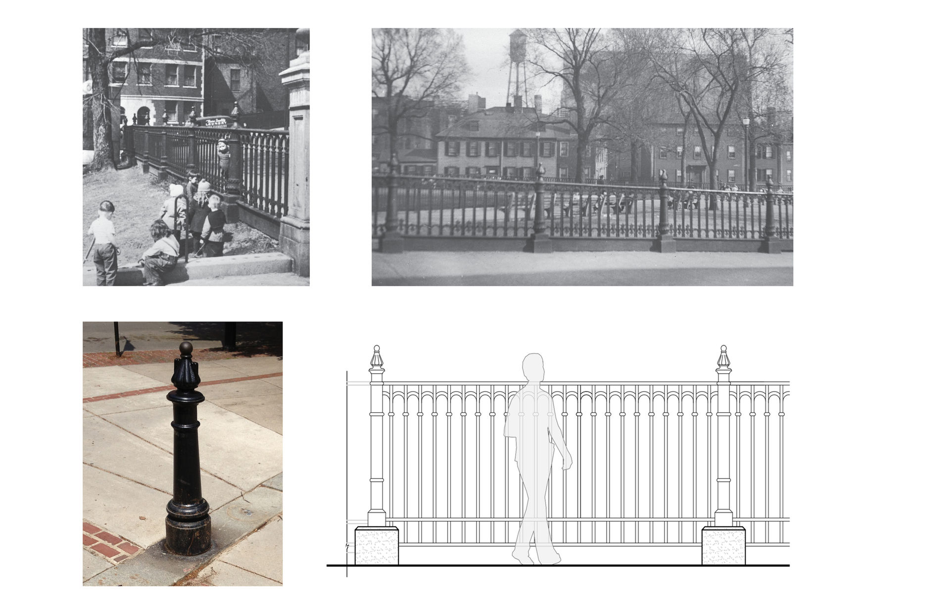 Site perimeter fencing which was once a defining feature of this urban park was replaced with a fence inspired by earlier ornate cast iron fencing seen in historic photos and postcards. Existing post finials were 3d scanned then scaled and fabricated to fit the new fencing.